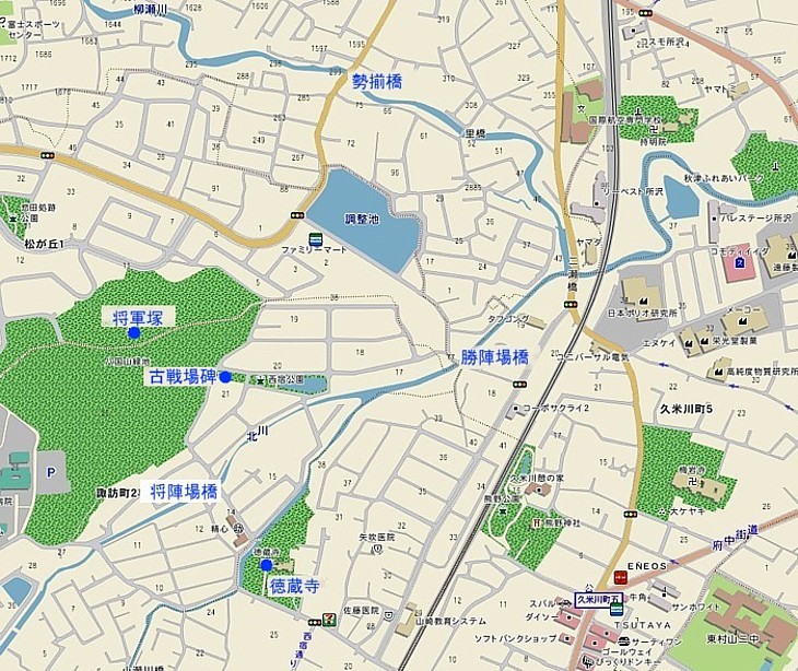 得蔵寺から古戦場碑のある西宿公園までは約400mだが八国山の将軍塚は更に300m、勢揃橋は古戦場碑から500m北になる。