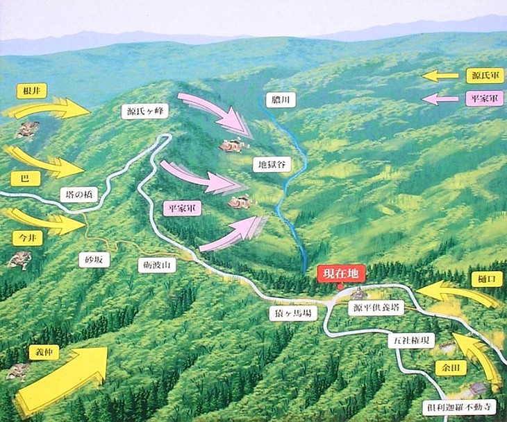 倶利伽羅峠攻防の絵図。火牛に追われた平家軍は地獄谷に蹴落とされたと言われるが...