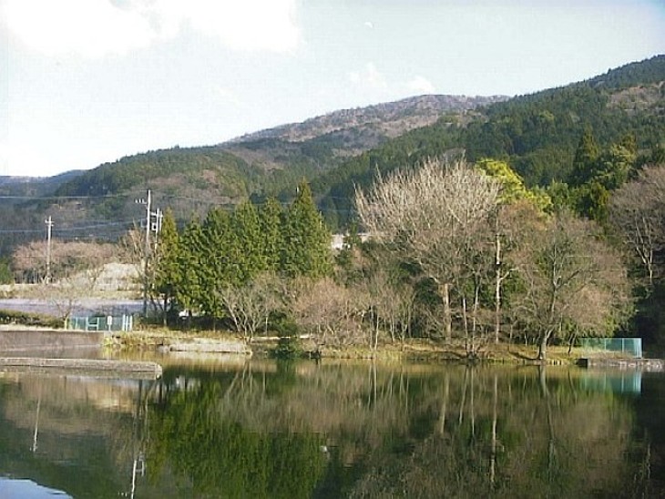 「まきば」は斜面に湧いている水源。すぐ上に熱函道路、背後の玄岳中腹に伊豆スカイラインが走る。