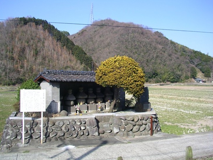 五輪塔が建つ廟所は菩提寺・真言律宗金剛廃寺跡の少し北側、狭い農道に面している。
