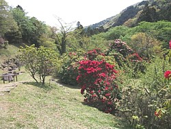 中&右: 川沿いも良く整備されツツジや石楠花が美しい。犬の水浴び向きの清流だが「マムシに注意」の看板を見ては敬遠せざるを得ないね。