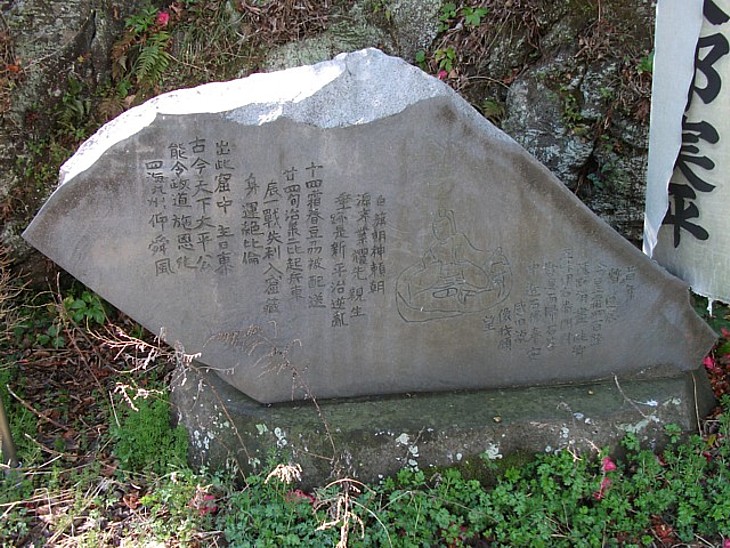 小松石の立派な石碑が置いてある。画竜点睛を欠く頭頂部の傷は倒壊による破損か。