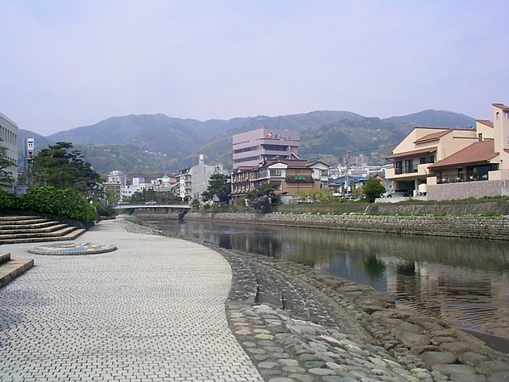 松川河川敷の石畳から上流を。山並み左隅の鞍部は大見郷へ抜ける冷川峠のあたりか。