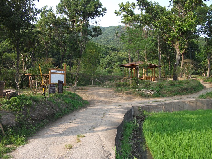 山裾に極楽廃寺の東屋が見えてくる。訪問した2010年頃は整備中で、今では歴史公園になっているだろう。