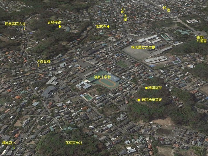 北側から見た鎌倉雪ノ下周辺の鳥瞰図。勝長寿院・鶴岡八幡宮・頼朝墓所などを表示した。