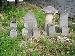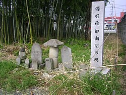 上: ファミリーマートの信号からスポーツ公園方向に歩き最初の路地を右折すると建物裏の竹薮前に石仏数基と「源有雅郷幽閉の処」の石柱があり、