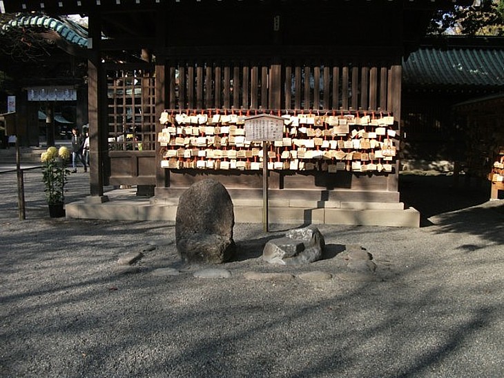 頼朝に関する史蹟の定番、左が頼朝・右が政子の腰掛石。左手の神門の先が神域となる。
