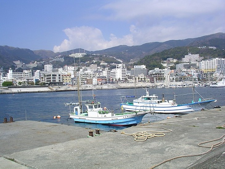熱海港の埋立地から和田浜の都松方向を。背後の山は右の日金山、左の「頼朝一杯水」へと続く。