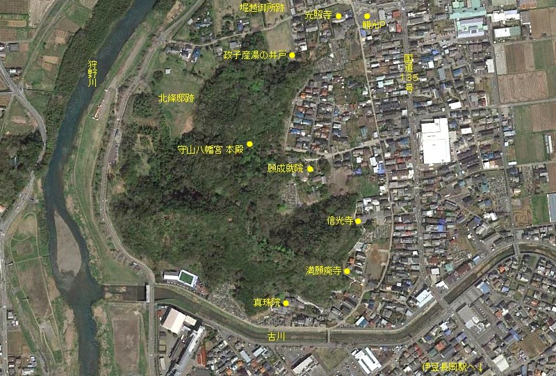 守山八幡宮周辺の鳥瞰図。願成就院の参拝者用か光照寺前の観光駐車場が利用できる。