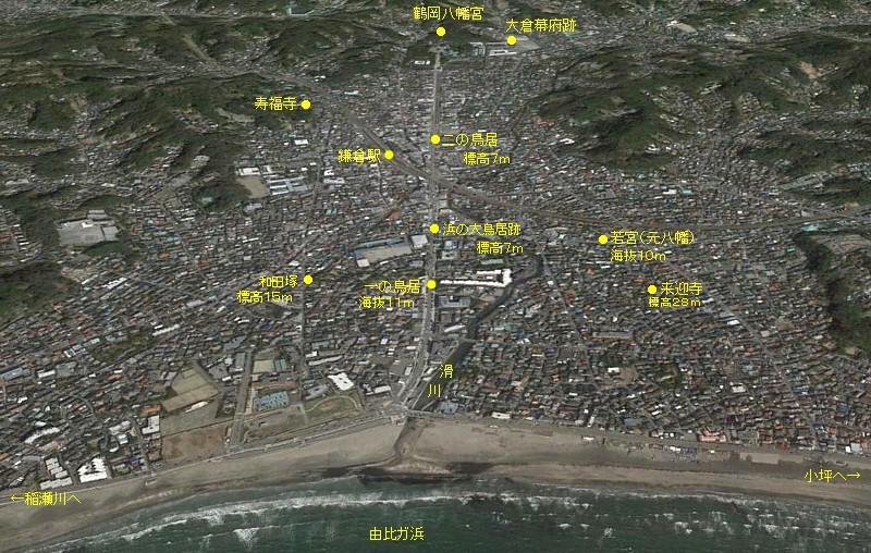 由比ガ浜上空から。平安末期の海水面は現在より高かった(2m前後か?)のを念頭に置く必要がある。