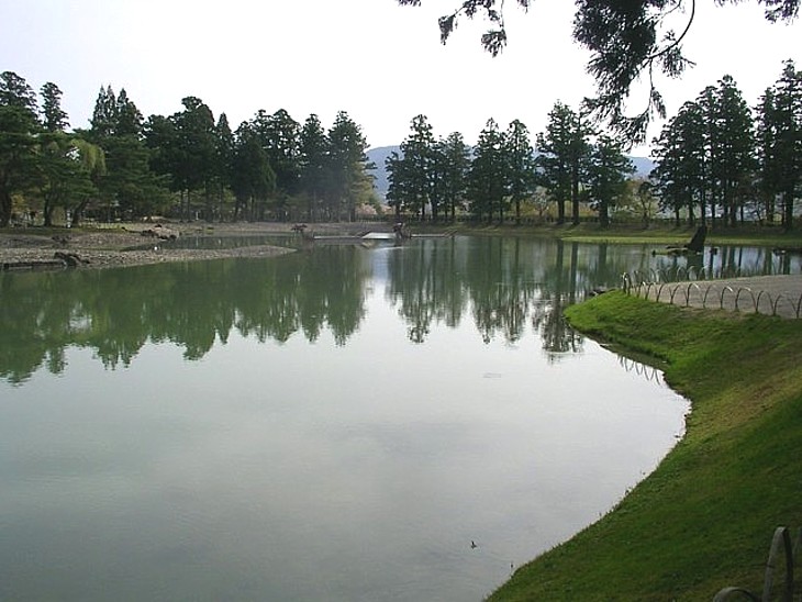 築山の右側から観自在王院の方向を。中島の大きさは東西70m・南北30mほど。