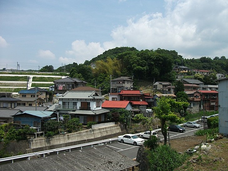来光川対岸の高台から宗時神社の森を。右手500mには東海道本線の函南駅がある。