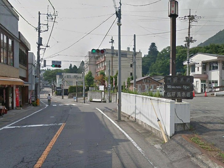 左側の橋から「塩原温泉ホテル」を過ぎると信号のある交差点。右側の観光案内の奥に無料駐車場がある。