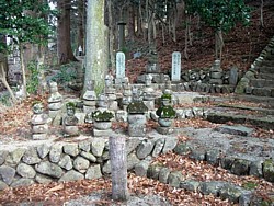 右: 本堂の左手奥に妙雲禅尼の石塔に登る石段が設けてあり、二つの墓標と数個の五輪塔が並んでいる。さらに左に進むと一般の墓苑に至る。