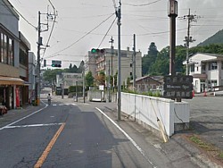 右: 左側に橋を見ながら「塩原温泉ホテル」を過ぎると久しぶりに現れる信号。右側の観光案内所(白い建物)の隣が無料駐車場に入る道路がある。