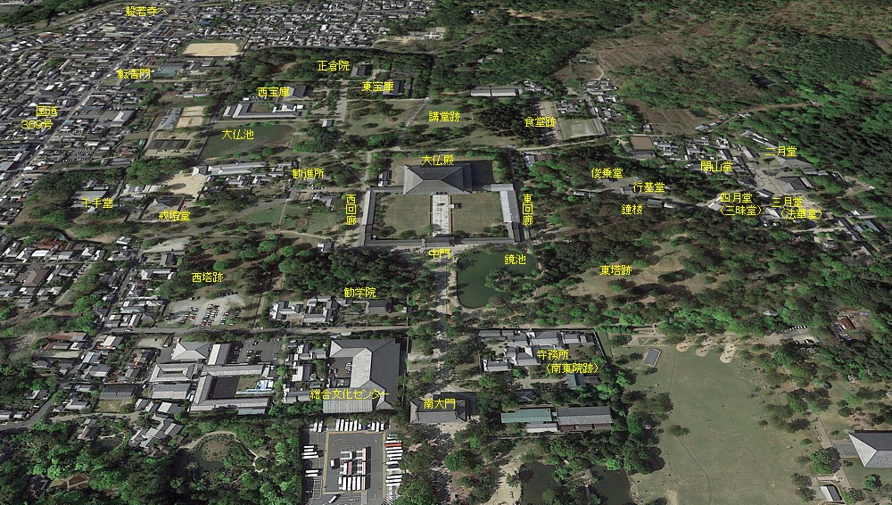 東大寺の鳥瞰。西隅の転害門、東隅の二月堂と三月堂(法華堂)を残して殆どの堂塔が灰燼に帰した。