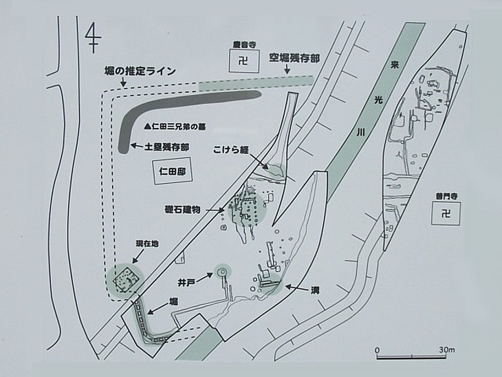史蹟発掘の全体図。南東部分は失われたが北の空堀と土塁は見事に保存されている。