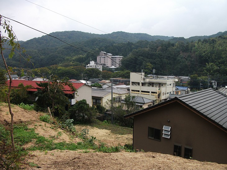 廟所の前から温泉街を眺める。昭和初期に迂回道路を造るため石祠を山裾寄りに遷したのが現在の廟所。