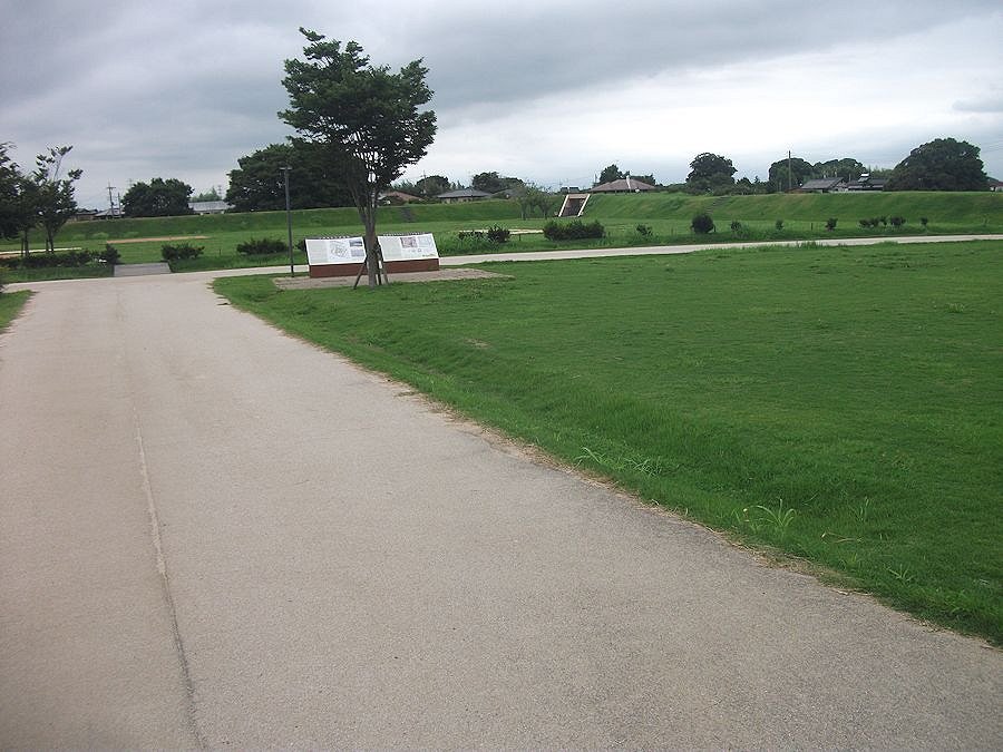 突き当りのT字路奥が建物域とされる只の芝生広場、正面に遺構の配置図、奥の土塁に旧筑波鉄道が城址を横切った入口がある。