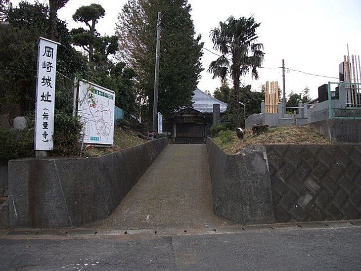 岡崎城址の標識が立つ瑠璃光山無量寺(浄土宗)。標高は約33m、この地域で最も高い。