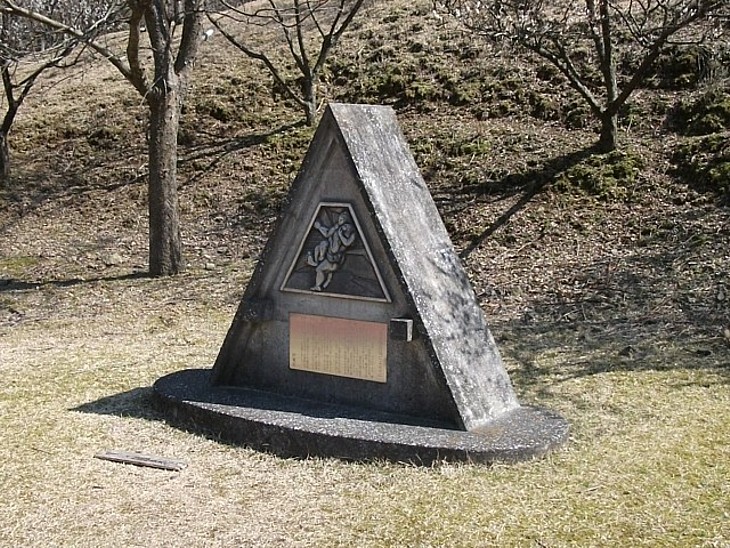 相撲場跡のモニュメント。俣野五郎景久を「かわづ掛け」で倒す三郎祐泰が描かれている。