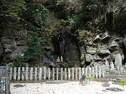 右: 弘法大師は住民を煩わしていた周辺に棲む魔物をこの岩谷に封じ込め、更に厳しい修行に励んだと伝わっている。