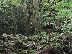 中&右: 奥の院からさらに2q(車も可)、巾が数mに狭まった湯舟川(桂川上流)沿いの広場に駐車してから山道を1kmほど登った中腹に
