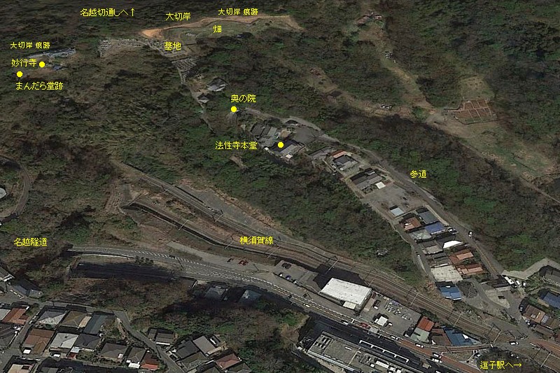 法性寺と名越切り通し周辺の地図と、推定されている大切岸の痕跡。