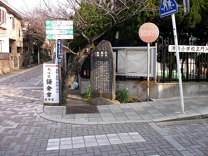 清泉小学校北西角に建つ大蔵幕府旧蹟碑は大正六年3月、鎌倉青年団の建立による。