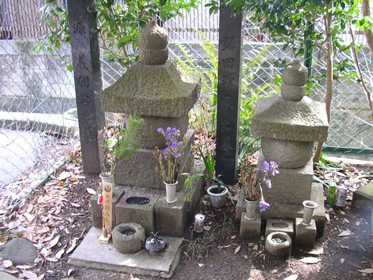 義朝と鎌田正家の五輪塔。風雨に晒されたように加工しているが、昭和末期に造られた慰霊墓に過ぎない。