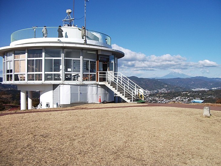 頂上からリフトの駅を撮影。熱海の玄岳に続く山並みの背後に冠雪の富士山が浮かぶ。