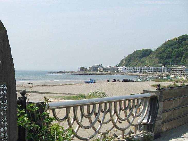 稲瀬川の碑からは海岸の埋立地と霊山山鞍部に登る道(大舘宗氏の突破跡か)のガードレールが見える。