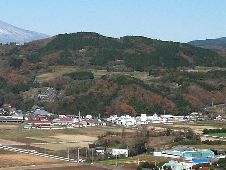 熱函道路から見た丹那盆地。赤い屋根が酪農王国オラッチェ、白い建物が丹那牛乳。
