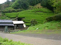 左中・・歩いたのは八十八夜が近い4月の下旬、狭い山裾の茶畑には若葉の緑が溢れ、砂状に舗装された歩道は足触りが柔らか。