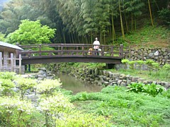 左側:木橋の上で記念撮影。公園は川沿いに芝生も造られ、古道の入口近くまで約500mの細長いレイアウトだ。