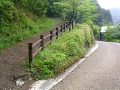 右側:宇津ノ谷峠の稜線にはトンネルの換気装置が造られており、この舗装道路はそこに向うメンテナンス用の作業道を兼ねている。