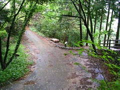 右側:左に山仕事用の道が分岐し、一段と細くなった遊歩道は通常のアスファルト舗装となり、更に奥へと続く。