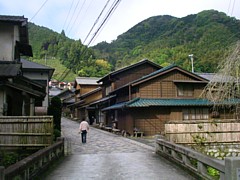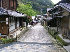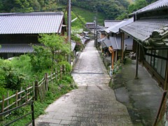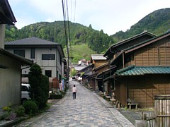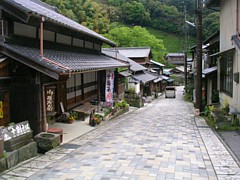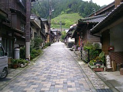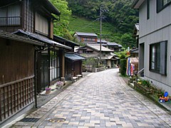左中:石段を下って宿場の家並みへ。道巾は矢張り約2間、綺麗過ぎる石畳に少々の違和感を感じるが...