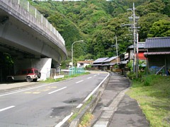 左中:下って来た道を元へと辿る。中央はバイパスが開通するまでの国道1号、左の上はバイパスから集落に入る車専用の陸橋。