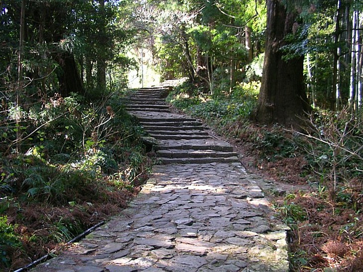 大門坂は石畳と石段が混在する古道。終点近くの傾斜は厳しいが山道より歩きやすい。