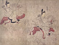 .. 平家物語は 「鎌倉勢と 木曽義仲 が戦った宇治川先陣争いで 佐々木高綱 が跨った生月 (いけづき) は4尺8寸 (145cm) 、極めて太く逞しい」 と書いた。 それに比べても奥州の馬は四川馬より遥かに大柄で、特に良い馬なら数百束もの稲 (現代に換算すると100万円近く) もの値が付けいた、と言う。頼義や 八幡太郎義家や 頼朝が奥州を欲しがった気持ちが良く判る。 . 右は 国宝の 随身庭騎絵巻、宝治元年 (1247) 頃の騎馬姿を描いている。 画像をクリック→ 別窓で拡大表示。 . 当時の男性の平均身長は160cm前後、それに比べても馬体は相当小さく感じられる。 | |||||||||||||||||||||||||||||||||||||||||||||||||||||||||||||||||||||||||||||||||||||||||||||||||||||||||||||||||||||