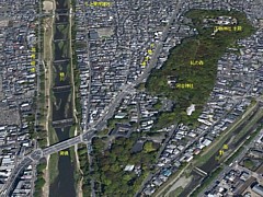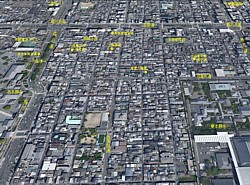 と同様に父の 頼義も殺生を重ね、奥州十二年の合戦 (前九年の役+後三年の役) では俘囚の首一万八千を斬り落とし、片耳を切り集め干して革籠に入れて京に凱旋したという。 .. 本来なら地獄に堕ちる筈の頼義だったが、後に出家して仏門に入り 六條坊門の北 西洞院の西側に建てた堂の土壇に俘囚の耳を葬って殺生を深く悔いたため成仏できた。これが耳納堂 (みのわ堂) だが当時の正確な位置は既に不明。一方で息子の 義家は罪のない人を大勢殺しても悔いる事がなかったから無限地獄に堕ちた、と。 . 右上は概ね地図と同じエリアの鳥瞰画像。クリック→ 別窓で拡大表示。 |