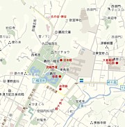 . ※寺社の位置: 大倉御所を中心に、八幡宮と勝長寿院と永福寺が 概ね三方の等距離にあるのが面白い。 .. 鶴岡八幡宮は治承四年 (1180) の着工、勝長寿院 (大御堂または南御堂、1460年頃に廃絶) は元暦元年 (1184) の着工、永福寺 (1405年焼失) は文治五年 (1185) の着工である。 . 右画像は頼朝が建立した三ヶ所の寺社の位置。 画像をクリック→ 別窓で拡大表示 |