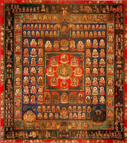 密教の経典を基本にした金剛界曼荼羅と、大日如来を中心に描いた胎蔵界曼荼羅 (右、クリック→ 別窓で拡大) の二種類があり、その曼荼羅を中心にして催す法会が曼荼羅供養となる。 .※善光寺再興: 頼朝は文治三年 (1187) 7月に下文を発行した。 . 信濃国の荘園と公領の沙汰人らに下す。 .善光寺造営のため人夫を手配して仏と結縁せよ。 . 善光寺は霊験殊勝の伽藍である。草創以来長い年月を経て堂宇の破搊が甚だしく、火災のため礎石だけが残る状態は実に嘆かわしい。国中の荘園公領を問わず力を合わせ、復興を勧進する上人に人夫を拠出するなどで功徳を尽くせ。 参加を拒む者は所領や管理権などの没収もある事を告知する。 更に翌 28日には信濃各地の国司目代 (代官) 宛に同様の下文を発行している。 .. ※善光寺: 特定の宗派に依らず万民の救済を目指す単立の寺 (公式サイト) 。天台宗と浄土宗 (尼僧) が 交互に貫首を務める異例のシステム。創建以来11回の火災に遭っているがその都度復興し、今回の勧進に貢献した頼朝を「大旦那」として祀っている。