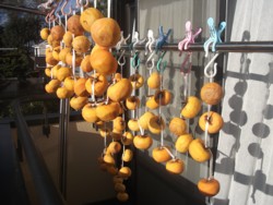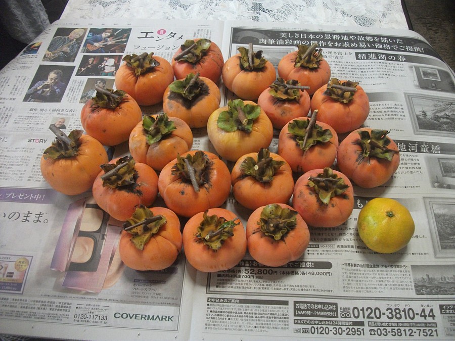 朝には雨が降り止んでいたので、思い切って富有柿を全部採取して干し柿造りをスタートした。皮を剥いて、1個づつ 5秒ほど熱湯を潜らせて、6〜8個づつポリ紐で縛ってベランダの物干し竿 (屋根の下) にぶら下げた。サイズは 6〜7cm、ついでに同サイズの次郎柿も 20個加えて、総数は 100を少し超えた。. 次郎柿はまた枝に 50個前後残っているので、全体では 150個前後の干し柿が出来上がる計算になる。 . 富有柿も次郎柿も完全な甘栗なのだが、甘でも渋でも干し柿にの素材としては問題ない、とのこと。 あとは湿気に注意する事と、時々焼酎を霧吹きで吹き付けて殺菌する事が管理マニュアルになる。 . 採取の時間は別にして、水洗い→ 皮剥き→ 熱湯消毒→ 紐付け→ 物干し竿掛け まで、二人で約 3時間を消費した。疲れたから早めの晩酌にする。明日にでも画像を追加しようと思う。 . ※: 右画像はベランダに干した柿の一部 (クリック→ 別窓で拡大表示) . . . 86代 後堀河天皇 . 月 日 . 吾妻鏡 . |