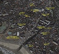更には、一の鳥居とは別に「由比浦の大鳥居」があった可能性も捨て切れない、と思う。また鳥居の痕跡が出土した地点の標高は約6mだが大量の人骨が出土した簡易裁判所敷地 (約400m南) の標高は約8m、集団埋葬地の方が高台なのも少し気になる部分だ。. 現在の一の鳥居北側から第一小学校の一帯は材木座沖の唐船から降ろした荷を積んだ小舟が入る入り江だったと考える説もある。右下画像 (別窓) を参照されたし。 . この地形を前提に鎌倉時代の姿を想像するのも面白い。人骨が大量に出土した集団埋葬地と推定される裁判所と由比ヶ浜周辺は当然ながら満潮になっても水没しない場所を墓地に選んだのだろうから。 ※潮に引かれ: 大地震直後なら津波の引き波か。下馬交差点は標高約8m、鎌倉時代の海水面が 現代よりも数m高かったらしい事を考えれば、5~6mの津波で大鳥居に付属した祠が流失したのは理解できる。「着岸の船」は沖に投錨したか和賀江島に停泊中の唐船を指すのだろう。 . |