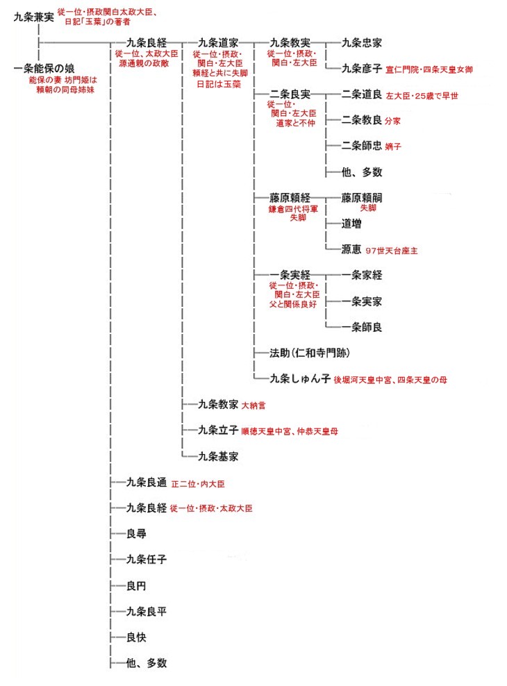 .. 道家は良実が北條時頼と内通して自分を陥れたと思い込み (ある意味自業自得の結果なのだが) 良実を義絶してしまう。 . 義絶事件がちょうどこの頃で、時頼が良実を慰めるための手紙を送ったのだろう、と思う。 . 道家は失意したままで翌年2月に死没、弘長元年 (1261) 4月になって良実が関白に再任し文永二年 (1265) 4月に弟の実経に関白を譲った後も朝廷の実権を掌握し続けた。 . 右は日記 「玉葉」 を書いた 九条兼実から続く系譜 (クリック→ 拡大) 別枠にはしていない。いつか政敵の 源 (土御門) 通親を含めた相関の系図を仕上げたいが、夢で終わるね。 | |||||||||||||||||||||||||||||||||||||||||||||||||||||||||||||||||||||||||||||||||