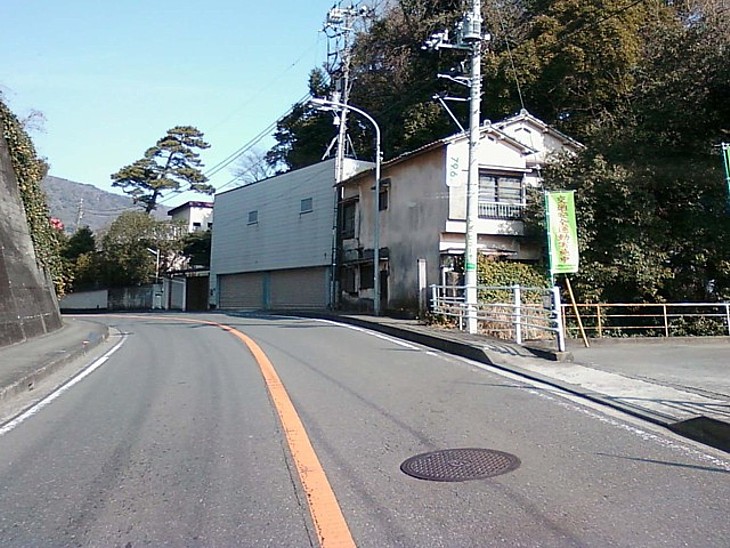 国道の上り方向から撮影。案内板は右手の民家と駐車場の境界部分に建っている。