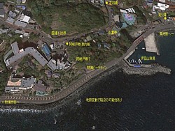 左: 伊豆山漁港沖からの鳥瞰。国道135号(当時は通っていない)から海岸までの距離は120mで高低差は50mだから約40度の急斜面になる。
