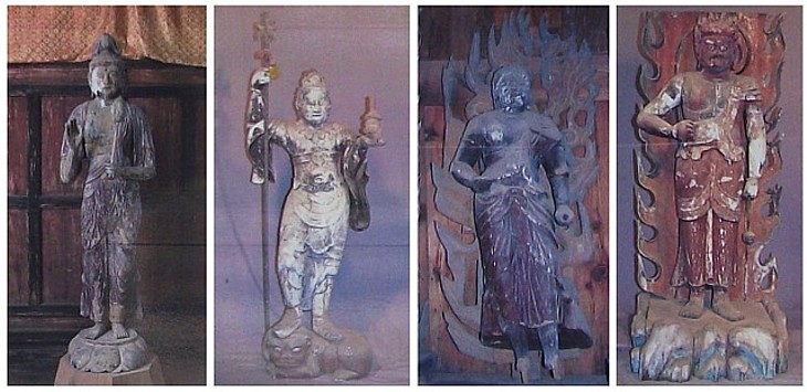 左から、前立観音・多聞天立像・平安時代末期の不動明王立像・鎌倉時代の不動明王立像
